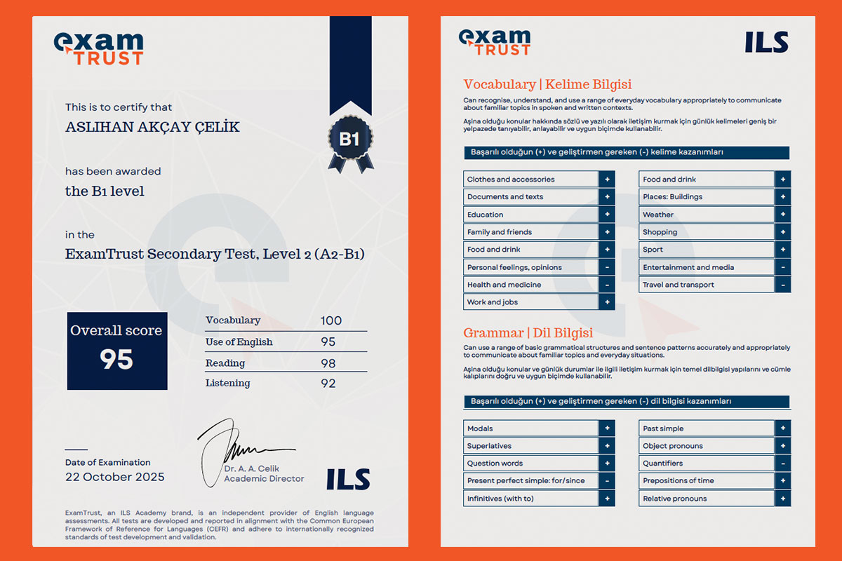 The certificates provided by ExamTrust are prepared in line with the Assessment of Learning approach and summarize students’ achievement levels in each language skill area. These certificates clearly show students’ levels, serve as a motivational reward and make the student’s place in their language learning journey concrete.